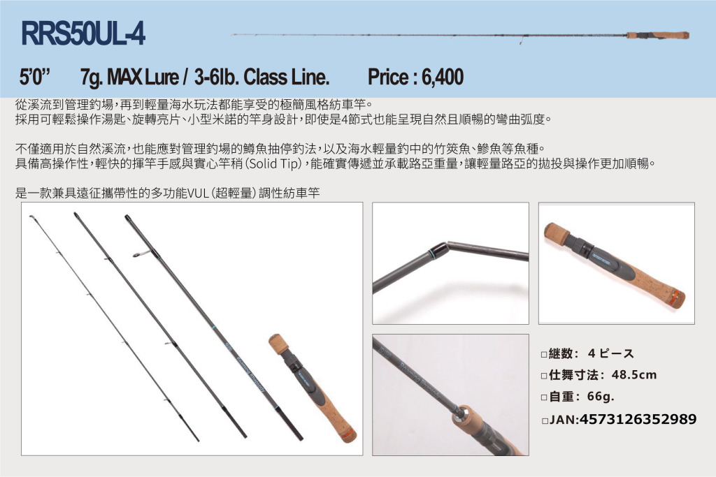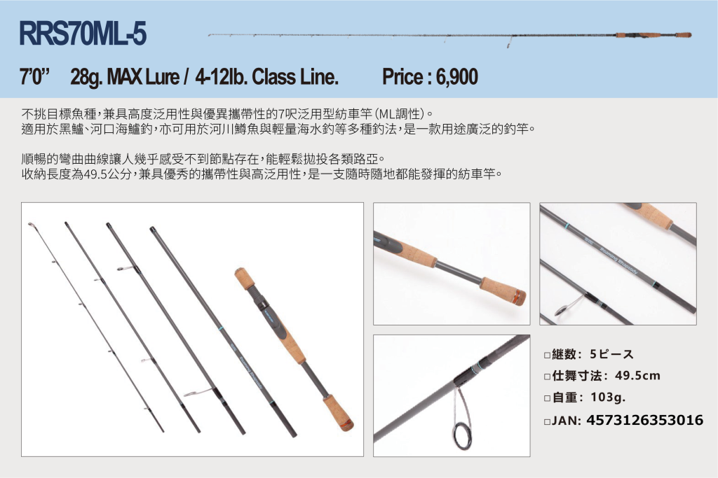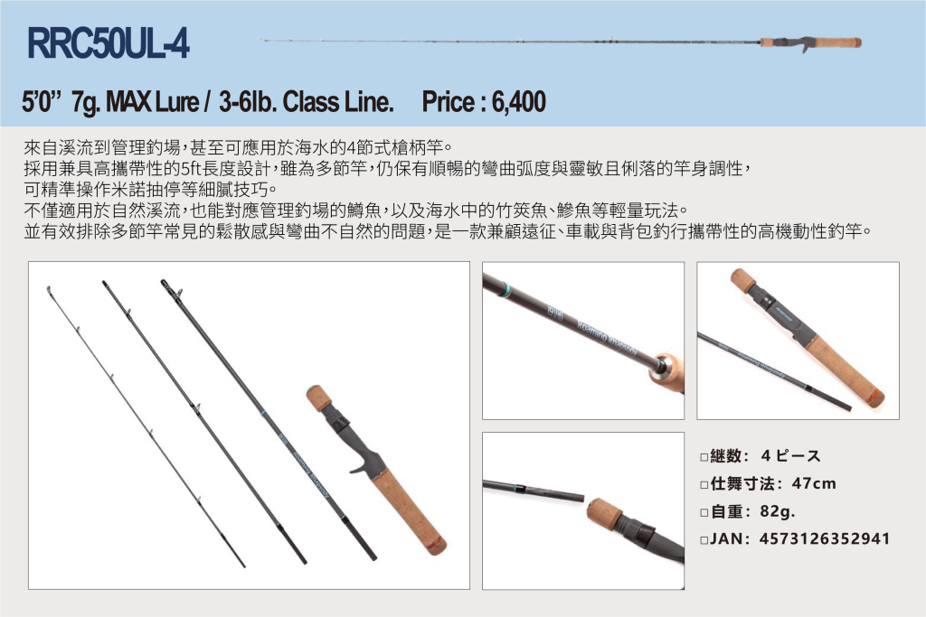 全系列皆採用多節式(Compact Rod)設計,兼具基本釣魚所需的性能,共有對應紡車捲線器4款、槍柄4款,合計8種型號(詳細請參閱其他資料)。
